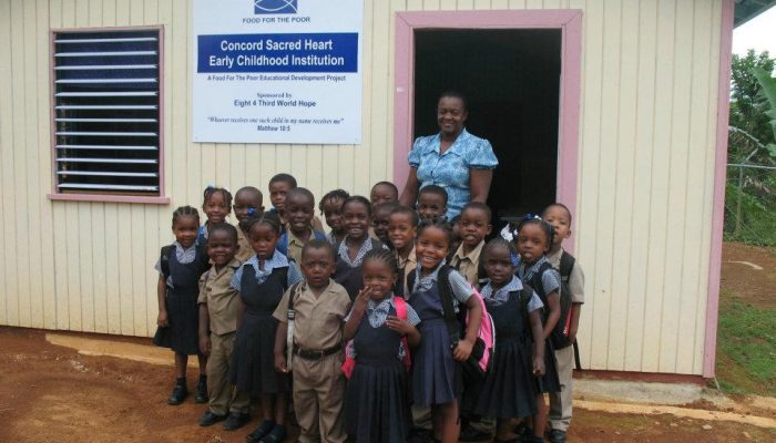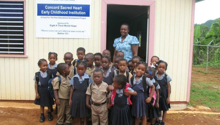 To best meet the needs of the children and families whom we are trying to help, Eight 4 World Hope chose to partner with Food For The Poor and its Jamaica School Construction Program. This program builds sturdy wooden schoolhouses using construction specifications that meet the Jamaica Ministry of Education’s requirements for a basic school in areas where no schools existed before or where the schools are simply old, rundown buildings and huts. Each school includes a classroom, kitchen, office, sanitation facilities, ceilings, interior painting, electrical wiring and fixtures, school furnishings and a wheelchair ramp.